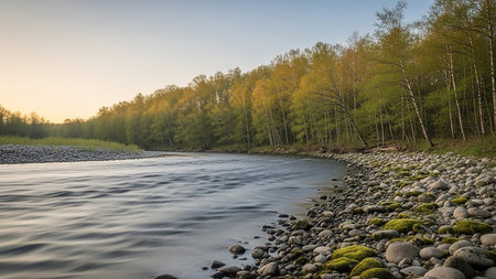 A tranquil river winds through a forest at sunrise. The water flows smoothly, reflecting the soft golden light of dawn. The right bank is covered in a multitude of rounded stones, some covered in vibrant green moss. The trees lining the forest edge display a mix of green and yellow foliage, illuminated by the gentle morning sun.
