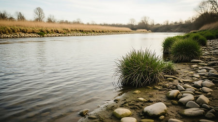 A tranquil river flows gently along its bank, which is covered in smooth, light-colored pebbles and patches of lush green grass. Tall, dry reeds and grasses line the opposite bank, with bare trees visible in the distance under a soft, cloudy sky. The scene is bathed in gentle daylight, creating a peaceful and natural atmosphere.
