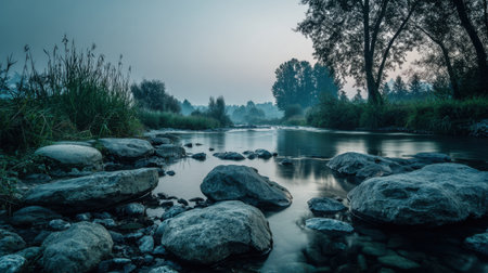 A peaceful river landscape at dusk with smooth stones lining the banks, trees shrouded in mist, and a calming atmosphere that invites relaxation and reflection.