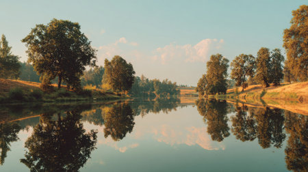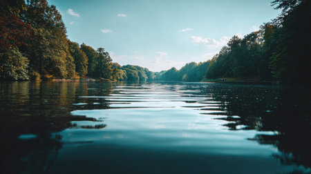 A picturesque view of a calm river bordered by lush trees reflecting on the water's surface under a clear blue sky, capturing the essence of tranquility.