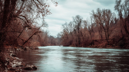Explore a serene river landscape showcasing calm waters, bare trees, and a cloudy sky. This tranquil scene captures the essence of nature's beauty and peace.