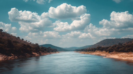A breathtaking view of a river winding through green valleys, bordered by gentle hills and bright blue skies adorned with fluffy clouds, showcasing nature's beauty.