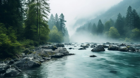 a foggy day envelops the river in a serene and peaceful ambiance. the light turquoise and dark green hues, reminiscent of the swiss style and german romanticism, create a captivating forestpunk atmosphere. this photo captures the essence of nature, making it perfect for those who appreciate hikecore aesthetics. ai generated