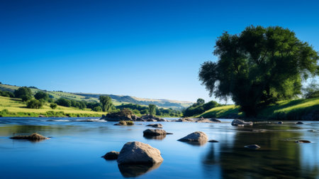 AI Generated. A peaceful view of a river winding through a meadow