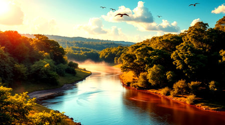 A breathtaking view of a calm river during a misty sunrise. The warm sun reflects in orange on the teal water, with birds flying overhead and silhouetted hills in the background.