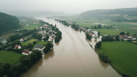A rural valley is overwhelmed with floodwaters, covering homes and fields after heavy rainfall. The landscape shows trees and rooftops peeking above the water, emphasizing the extent of the flooding.