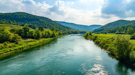 A breathtaking view of a calm river reflecting lush green hills and a blue sky, creating a peaceful atmosphere ideal for nature lovers and photographers.