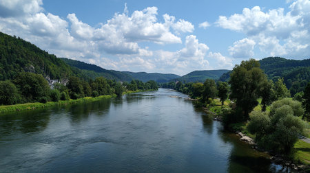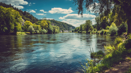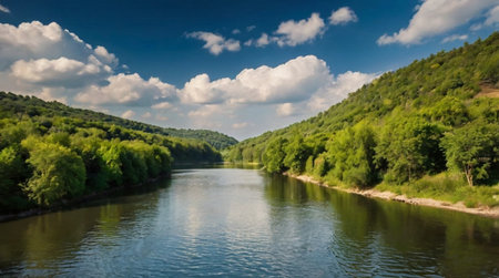 A stunning river landscape framed by vibrant greenery under a sunny sky. Lush trees line the banks, while fluffy clouds cast shadows over the glistening water.