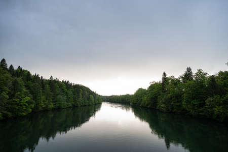 Beautiful stream of river Sava in Slovenia with green forest on its shore.