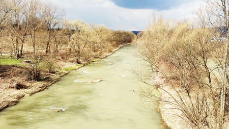 River landscape with sand bank appearing on the shore at low water levles. Small river in the forest. Quiet river in the forest. Trees and bushes on the bank of a small river. Reeds and old trees on the river bank.