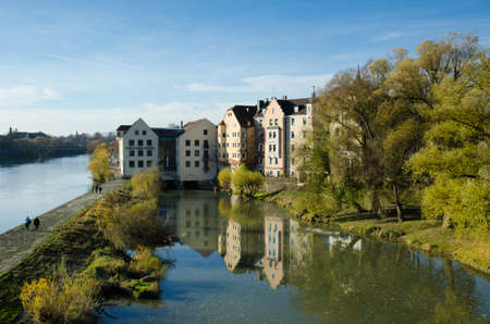 Regensburg, Bavaria, Germany - 11/11/2014: Danube River. Houses on Naberzhnaya. The stone bridge is the main attraction of Regensburg.