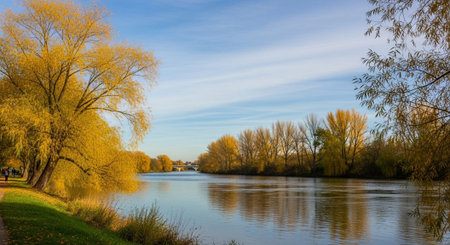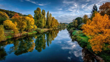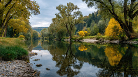 A tranquil river landscape showcasing vibrant autumn trees with reflections in the calm water, creating a peaceful and serene atmosphere ideal for nature lovers.