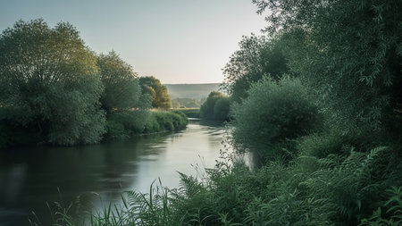 A tranquil river meanders through a vibrant green landscape under the soft light of a setting sun. Lush trees and dense foliage line the banks, with ferns and grass growing along the water's edge. The gentle flow of the water creates a peaceful and serene atmosphere, capturing the essence of natural beauty at dusk.