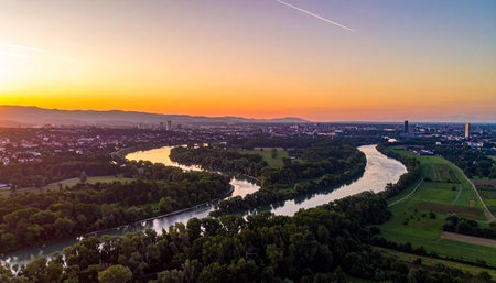 Aerial view of the Danube river at sunset, Vienna, Austria