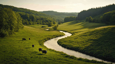 Cows graze leisurely in a verdant valley, with a serene river flowing through the landscape under the warm glow of the setting sun.