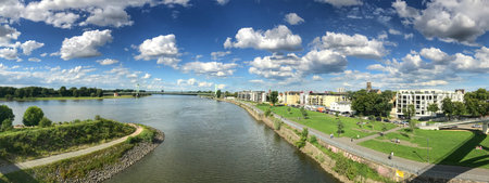Wide panorama of a peaceful riverside with lush greenery, scenic urban landscapes, and serene water.