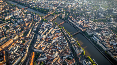 High-resolution aerial view of Frankfurt with bustling streets and the financial district