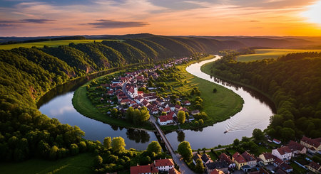 An aerial view captures a winding river passing through a green valley dotted with houses and surrounded by rolling hills under a bright sky.