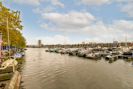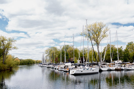Boats parking in water. Boats docked in river under blue sky and cloudy in summer.