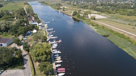 aerial photography of the Iset river and the boat station, the banks are hilly covered with grass and trees, a small town in the Urals. Kamensk-Uralsky, Russia - August 15, 2022