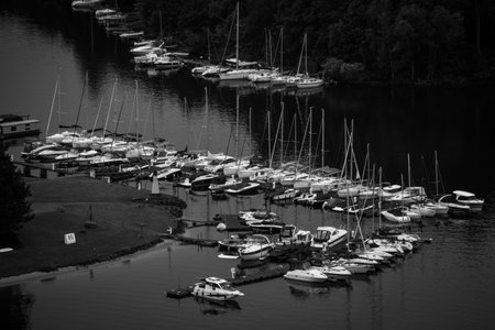 Monochrome image of boats docked at a quiet riverside marina in RabynÄ›.