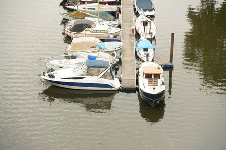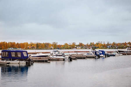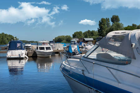 Motor and sailing yachts are moored in the marina of the yacht club. Saint-Petersburg. Russia.