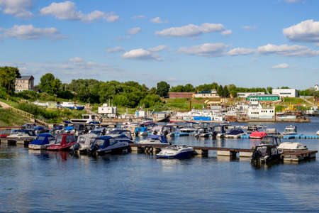 Boat and yacht parking. A marina lot. Yacht and sailboat is moored at the quay. The Volga River near Kazan.