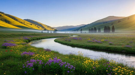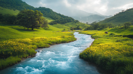 This stunning image captures a flowing river meandering through a vibrant green valley, adorned with blooming wildflowers under a soft cloudy sky.