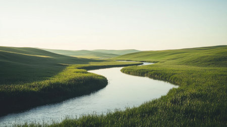 In a tranquil countryside setting, a gentle river meanders through rolling green hills under a clear sky. The landscape showcases vibrant grass and a peaceful atmosphere, perfect for reflection.