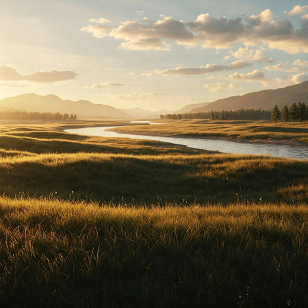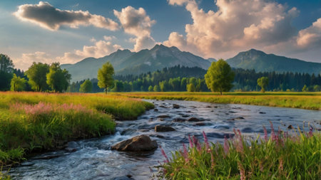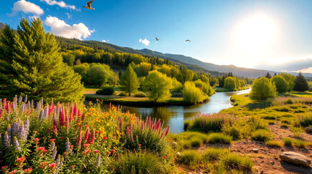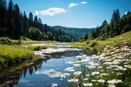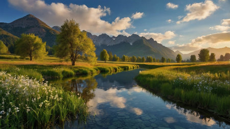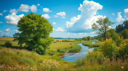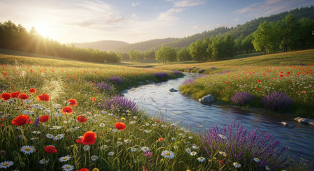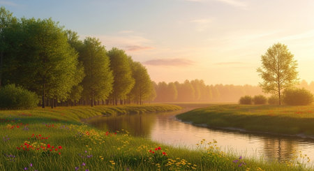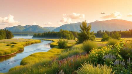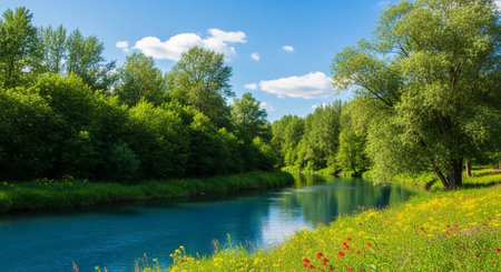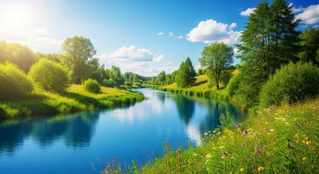 Serene landscape with flowing river and meadow flowers