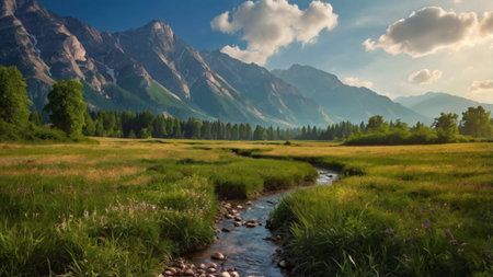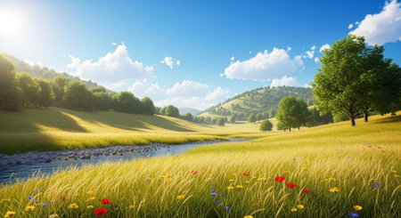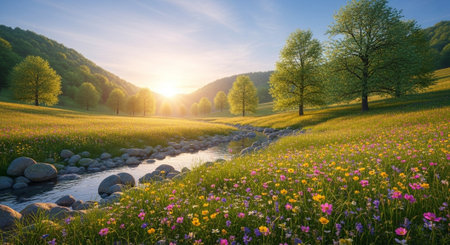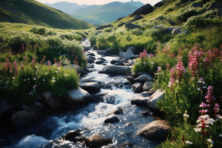 A stream gracefully cuts through a breathtaking hillside covered in lush green vegetation, A lush valley filled with wildflowers and a bubbling brook, AI Generated
