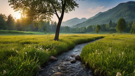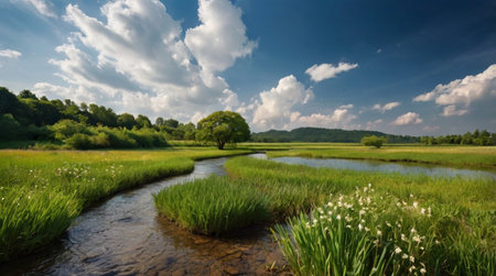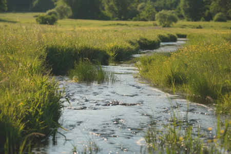 A stream flows through a vibrant green field, creating a picturesque scene of nature in motion, A babbling brook winding its way through a peaceful meadow