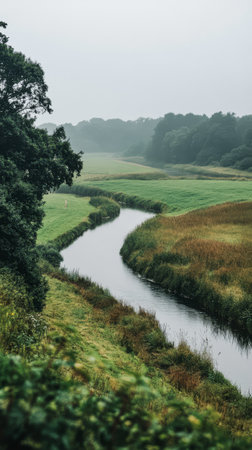 A calm river winds through expansive green fields and gentle hills enveloped in morning mist. The tranquility of nature is evident in this peaceful landscape.