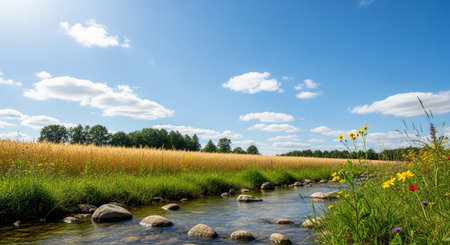 Scenic Summer Landscape with Flowing Stream and Wheat Field