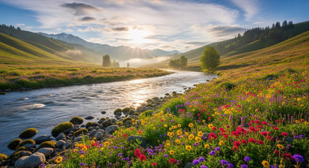 Scenic river landscape at dawn with mountains and wildflowers