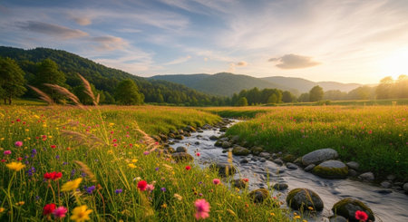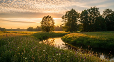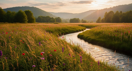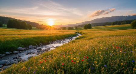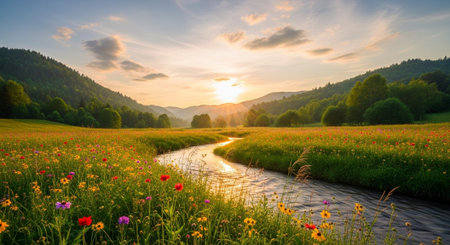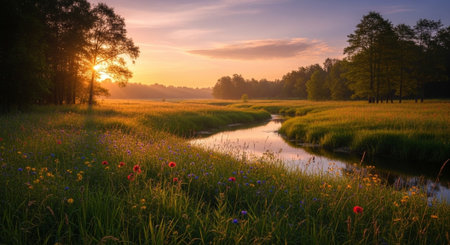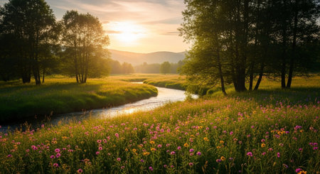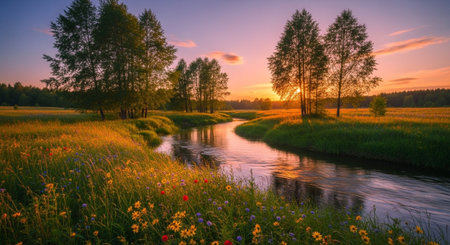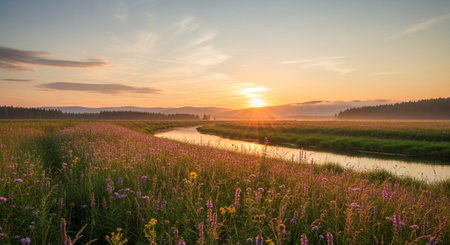 Sunset over a meadow with wildflowers and a small river