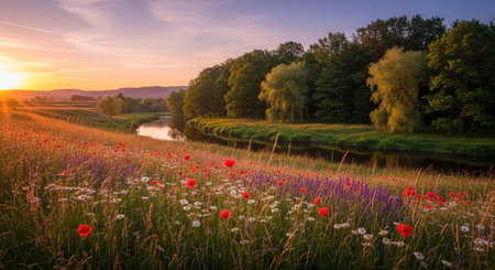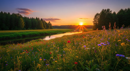 Sunset over a meadow with wildflowers and a river