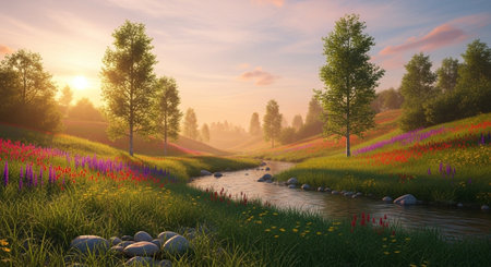 sunrise illuminating a lush grass field and the serene water in the background, captured in the iconic style of unreal engine 5. delicate flowers add a touch of beauty to this dutch and flemish-inspired scene. the physically based rendering and vray tracing techniques create a visually stunning and detailed image. ai generated