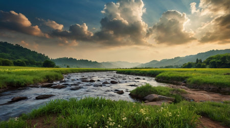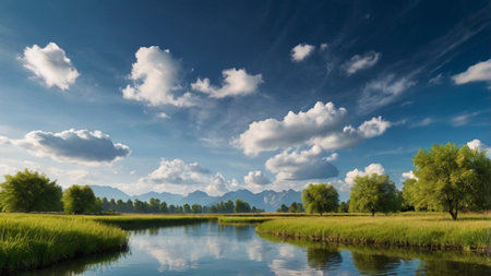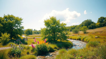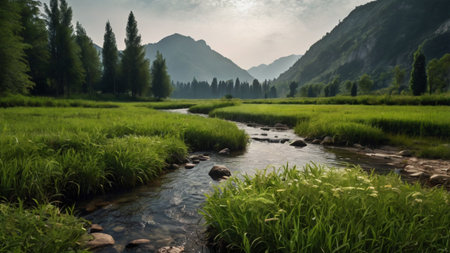 Generative AI : Beautiful panoramic background image of the countryside with a slowly flowing stream and dense thickets of bushes along the banks against the backdrop of a pictures
