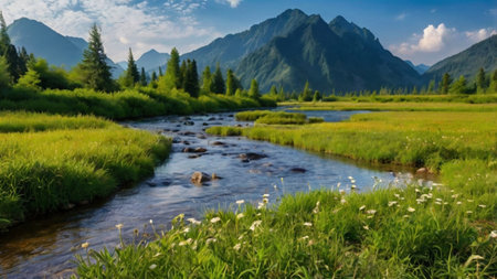 Beautiful summer mountain landscape with green meadow and mountain river.