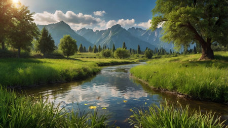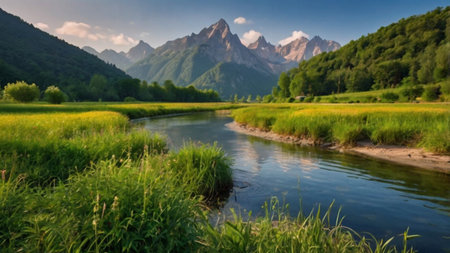 Beautiful spring landscape with a small river and high mountains in the background