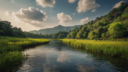 Serene river flowing through a lush green valley