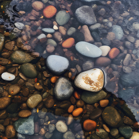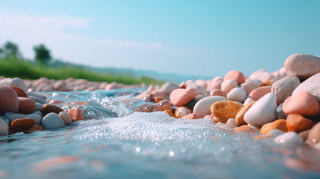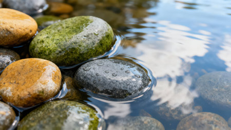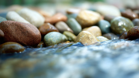 A captivating image of colorful pebbles and smooth stones submerged in gentle flowing water, embodying nature's tranquility and inviting calmness. Perfect for relaxation themes.