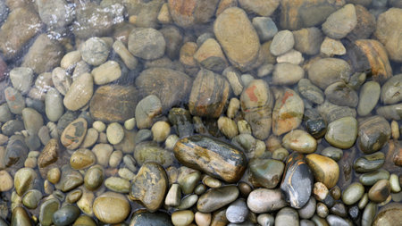 rounded texture stones in transparent water as a natural background, stone space of a sea or river bank in a small amount of water, tide-turned cobblestones as a banner full frame