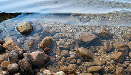 This captivating image showcases a tranquil shoreline adorned with smooth, colorful stones emerging from a serene body of water under soft natural light.