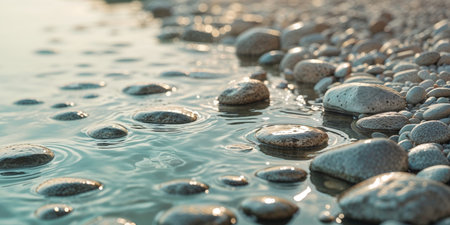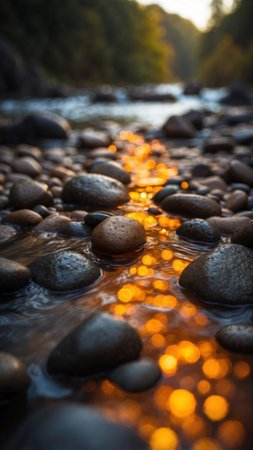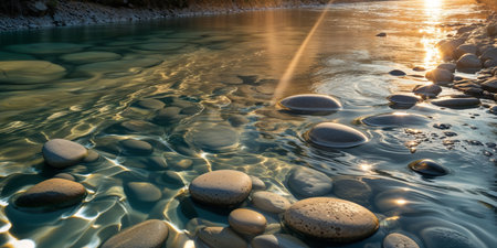 Rounded grey and brown stones resting along the riverbank edge, featuring a precise focus on water ripples reflecting warm golden light contrasted against the cool clear blue water surrounding the...