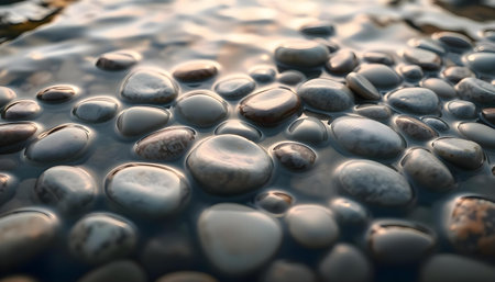 smooth pebble stones by a riverbed, created with generative ai