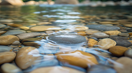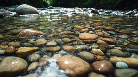 A serene riverbed featuring smooth stones and pebbles under clear water. This tranquil landscape captures the beauty of nature and peaceful vibes.