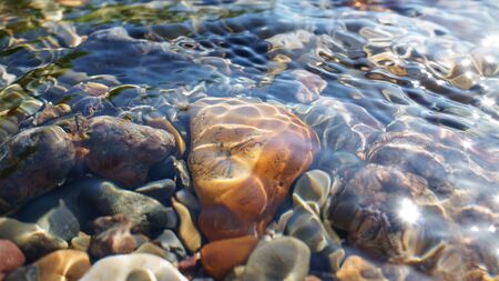 Beach pebbles under clear water at sunny day