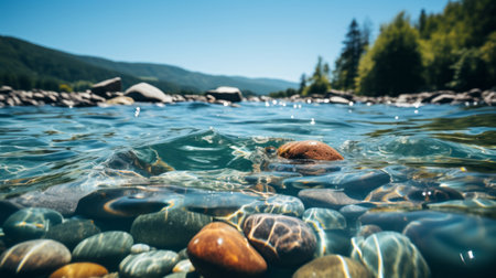 AI Generated. tranquil symphony of shimmering rocks and dancing water creates a mesmerizing tapestry of reflections and textures along idyllic riverbank or shore